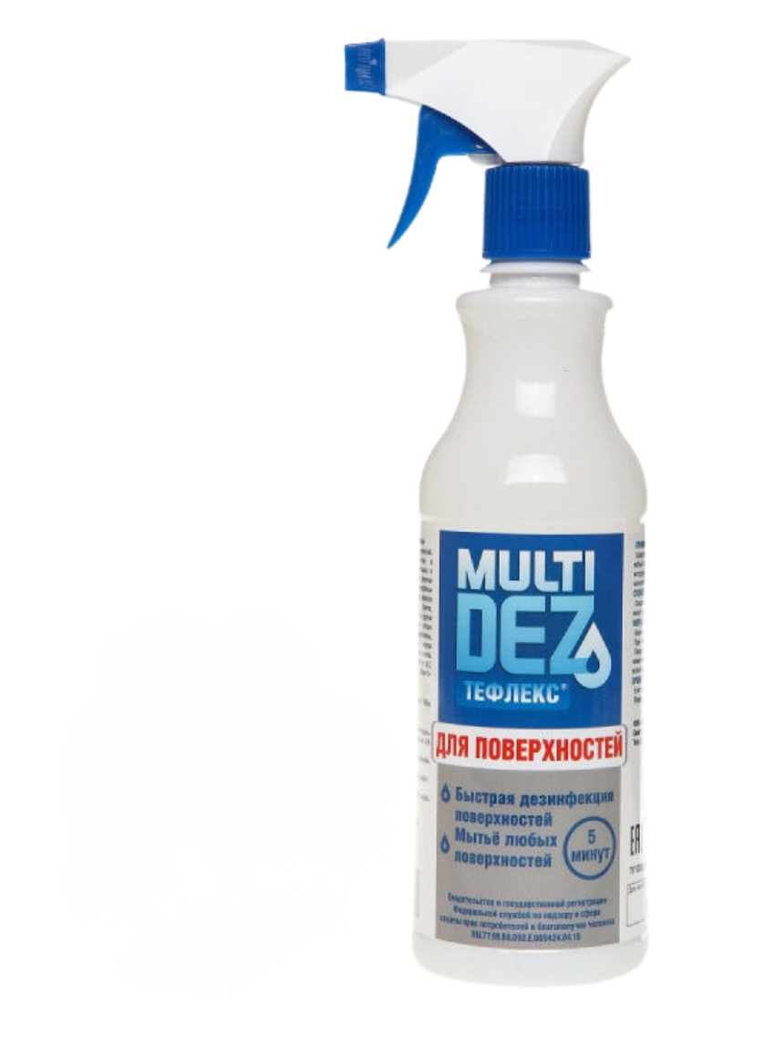 Мультидез-Тефлекс - для мытья и дезинфекции поверхности. Обладает антимикробной активностью в отношении бактерий (включая туберкулез), вирусов (гриппа, в т.ч. птичьего, свиного и т.д. полиомиелита, энтеровирусы, гепатиты, ВИЧ-инфекция, атипичная пневмония), грибов (рода Кандида, Трихофитон, плесневые грибы).