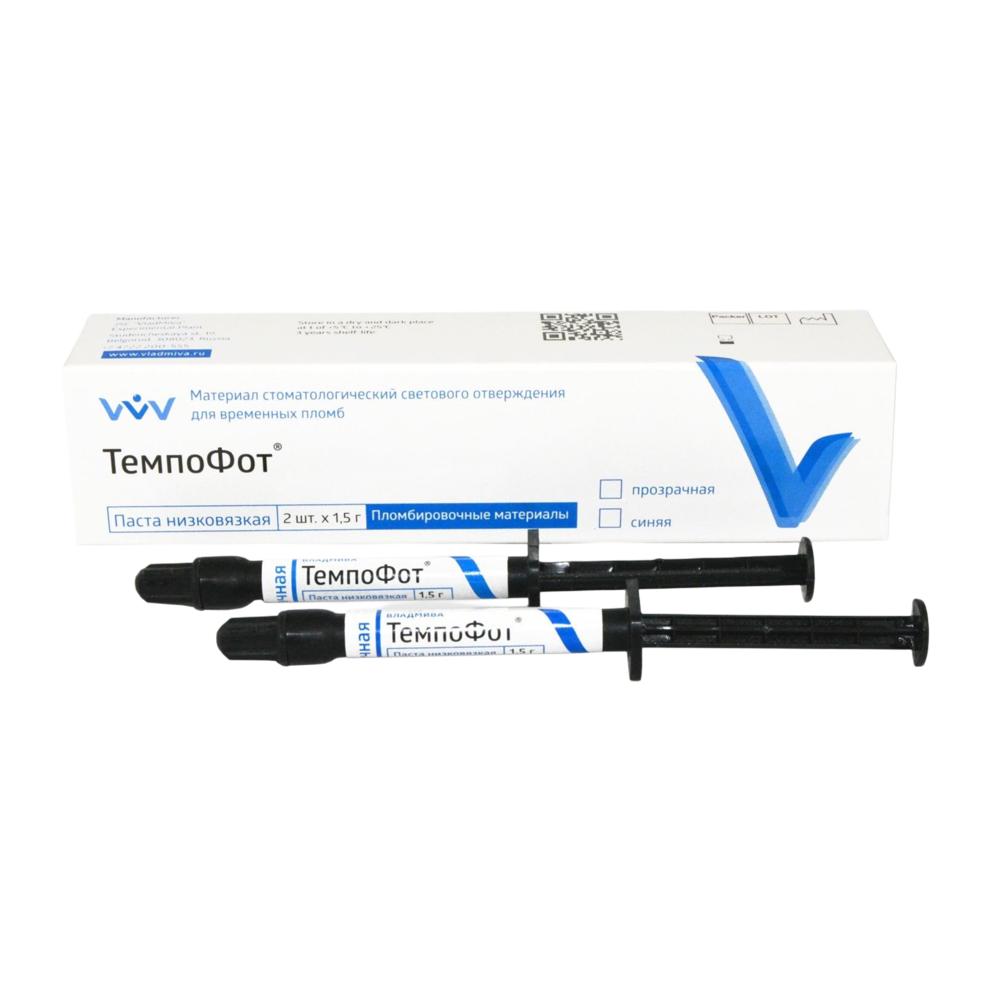 «ТемпоФот» представляет собой светоотверждаемый композиционный материал на основе полиуретанакрилата и мелкодисперсного наполнителя. Материал выпускается в виде пасты (прозрачной и синей), в состав которой входят: активаторы светового отверждения, стабилизаторы, технологические добавки, обеспечивающие оптимальную консистенцию, бактерицидное вещество (хлорид бензалкония), которое оказывает микробостатическое и микробоцидное действие на бактерии и кандиды.